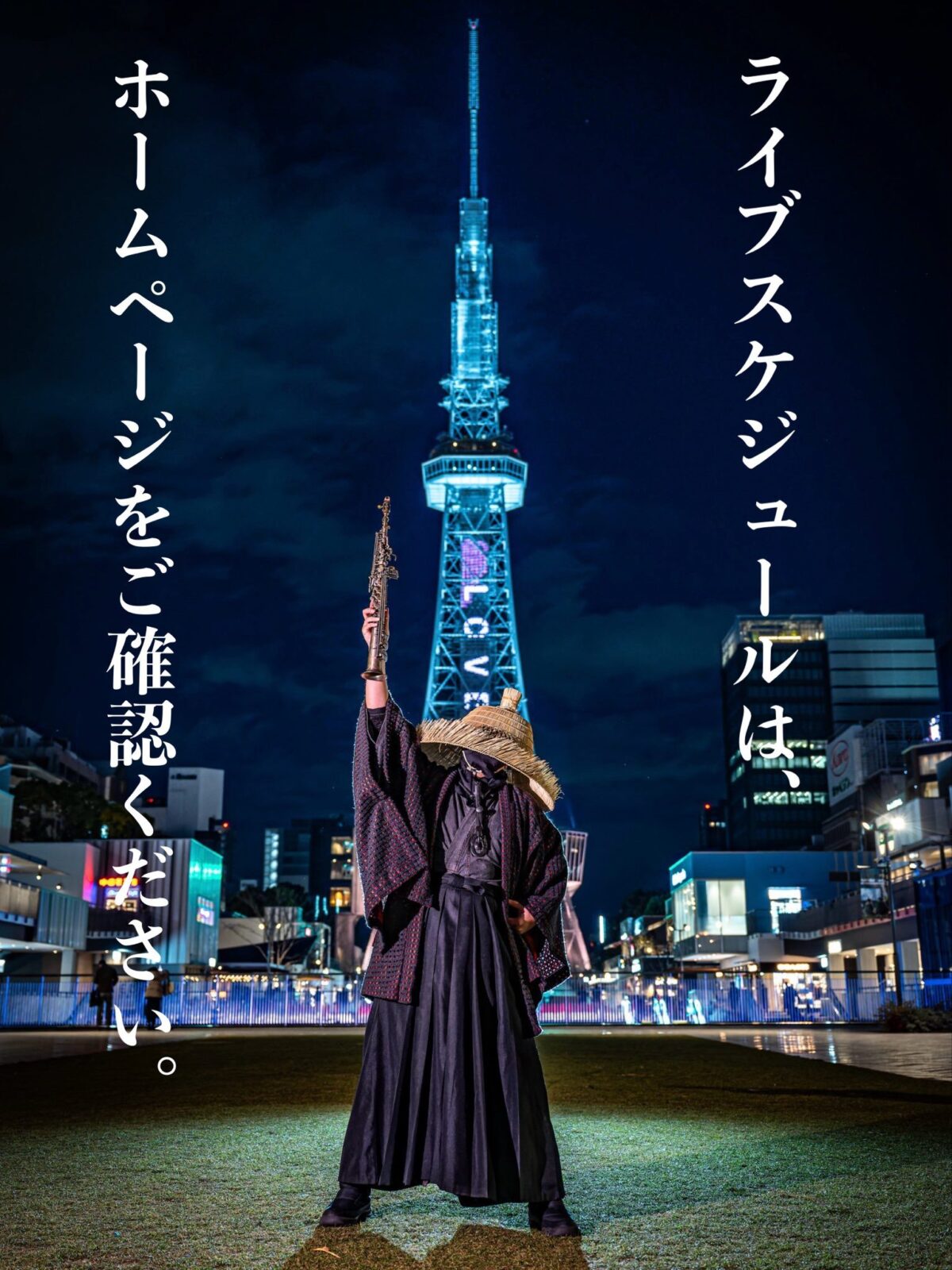 編み笠をまとった侍の姿でサックスを奏でる、名古屋発のストリートアーティストによる屋外ライブです。鶴舞公園 正面広場を会場に、ライトアップされた噴水塔を背景とした演奏が行われます。毎週木曜日に開催され、公園を行き交う人々の足を止める名物ライブとして親しまれています。