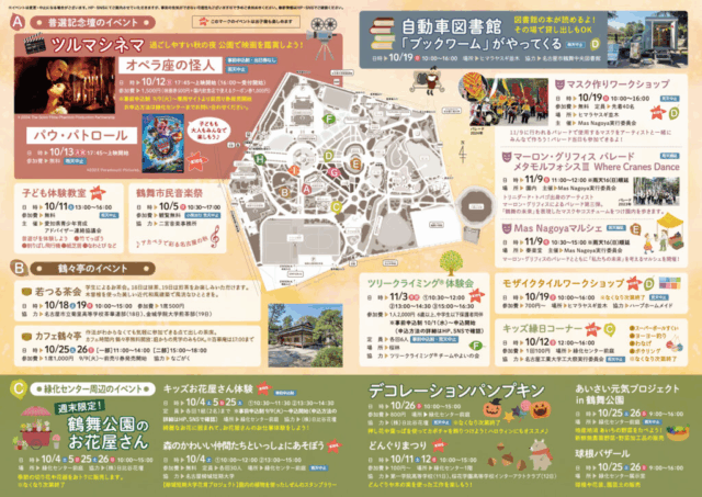 名古屋の秋を彩る恒例イベント「鶴舞公園秋まつり2025」が、今年も開催されます。期間中は映画上映「ツルマシネマ」、音楽イベント、市民マルシェ、ワークショップ、フードイベントなど、多彩なプログラムが盛りだくさん。子どもから大人まで楽しめる企画が毎週末に登場し、秋の公園が賑わいに包まれます。キッチンカーやグルメフェス、季節の花と触れ合える催しもあり、家族や友人と一緒に秋の一日を満喫できるイベントです。